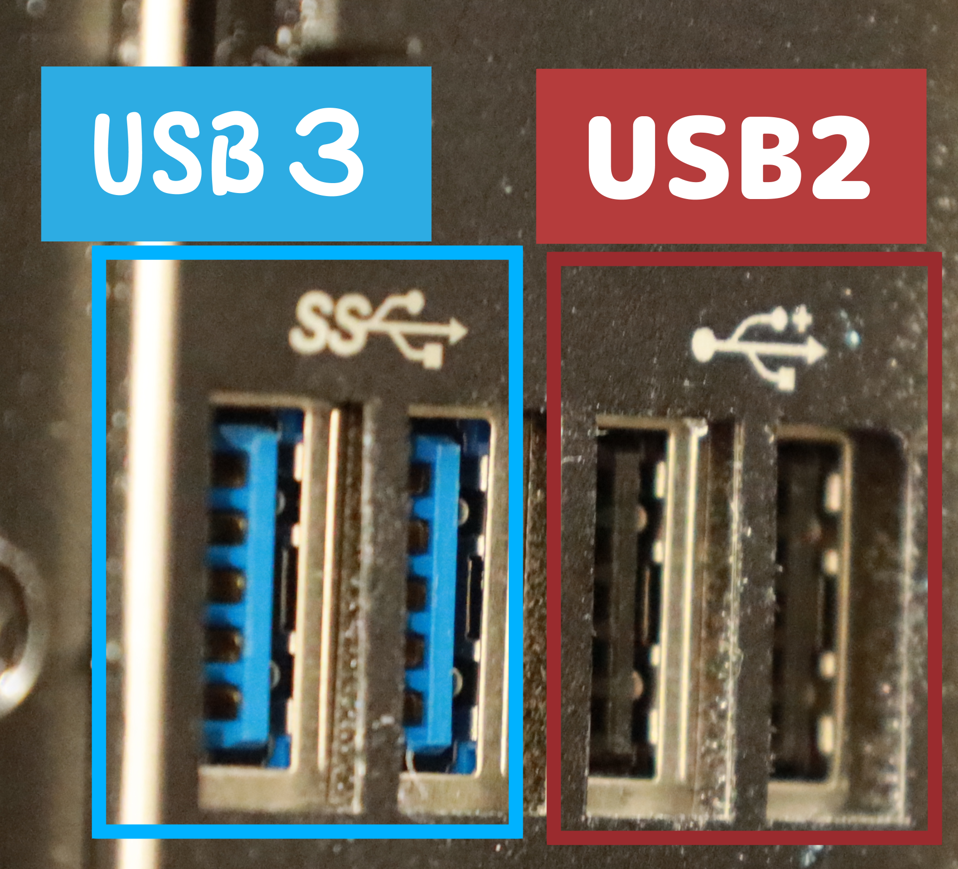 端子が青い色で塗られていてわかりやすいわね。USBってバージョンを意識したことがなかったけれども、初めて意識するようになったわ。2000年頃にはUSBってあったんだけれども、速度が早いかどうかで、使えないってことは今までなかったの。